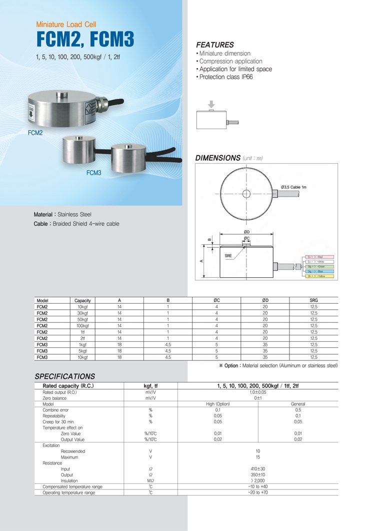 韓國Fine FCM3-1KG屬于小型壓式稱重傳感器,FCM3系列壓式低平臺稱重傳感器(1kg-10kg),FCM3微型稱重傳感器是專為壓式低平臺而設計;韓國Fine FCM3-1KG稱重傳感器小巧的尺寸使FCM3稱重傳感器有非常廣泛的應用,包括測試和稱重系統。韓國Fine FCM3-1KG 17-4PH不銹鋼材料設計,用于惡劣環境中緊湊尺寸,低平臺,全焊接不銹鋼密封設計。