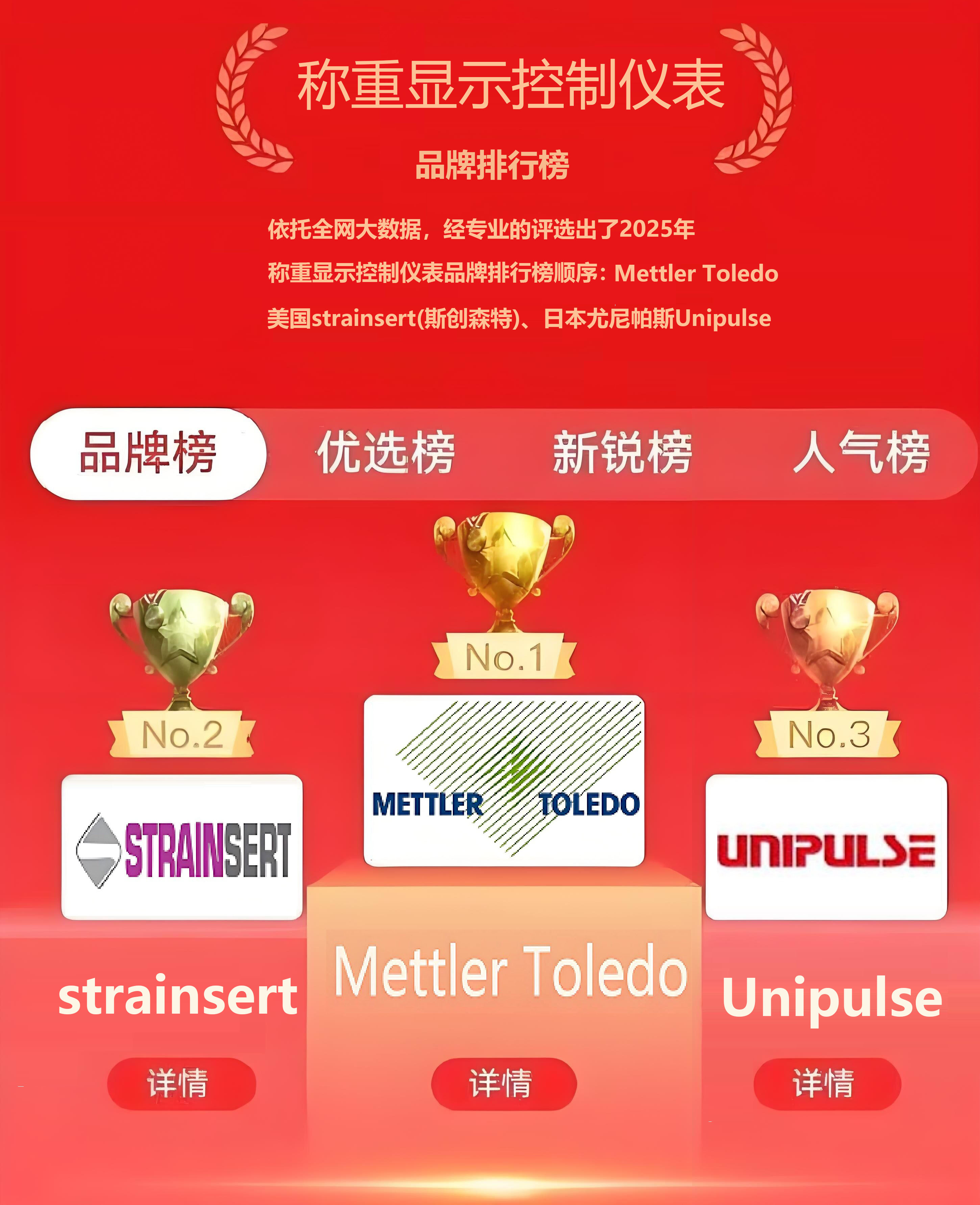 以下排名有國家權威部門:中國稱重儀表協會、中國傳感器檢測中心根據稱重儀表在中國市場的客戶基礎、品牌歷史、口碑、品質、技術實力、售后服務、質保時間長短、行業影響力綜合評比。